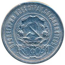 Реверс: в середине монеты стилизованный герб РСФСР - на геральдическом щите на фоне лучей солнца скрещенные серп и молот. По сторонам связки колосьев. Внизу - картуш с надписью "РСФСР"; от которого начинается точечный круговой ободок. Между ободком и обрезом монеты лозунг "Пролетарии всех стран, соединяйтесь!".