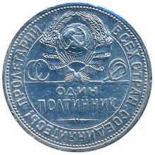 Реверс: верхний сектор монеты занимает герб СССР ссемью витками перевязывающей ленты. По сторонам герба снизу надпись "СССР" по две буквы с каждой стороны. В нижнем секторе номинал, написанный в две строки: "ОДИН полтинник". Между двумя круговыми ободками - точечным и линейным - лозунг "Пролетарии всех стран, соединяйтесь!".