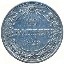 Аверсв середине круга, обрамленного точечным круговым ободком, номинал, написанный в две строки: "20 копеек". Между внутренним и внешним точечными ободками вверху плоская звезда с отходящими от нее девятнадцатью лучами. Под номиналом - дата. Слева - лавровая, справа - дубовая ветви, связанные внизу бантом.