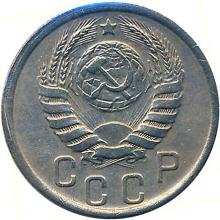Реверс: герб СССР с семью витками перевязывающей ленты. Под ним полукругом со ступенчатым расположением букв надпись "СССР".