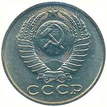 Реверс: герб СССР с пятнадцатью витками перевязывающей ленты. Под ним горизонтальная надпись "СССР".