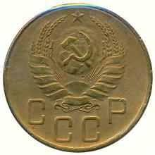 Реверс: герб СССР с одиннадцатью витками перевязывающей ленты. Под ним полукругом со ступенчатым расположением букв надпись "СССР".