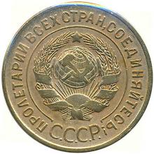 Реверс: герб СССР с семью витками перевязывающей ленты, под ним надпись "СССР", от которой начинается линейный круговой ободок. Между обрезом монеты и ободком лозунг "Пролетарии всех стран, соединяйтесь!".