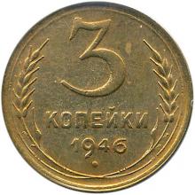 Аверс: номинал "3 копейки", написанный в две строки, под ним дата, ниже - точка. По бокам колосья, стебли которых пересекаются и образуют круговой ободок.