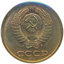 Реверс: герб СССР с пятнадцатью витками перевязывающей ленты. Под ним горизонтальная надпись "СССР".