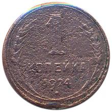 Аверс: номинал, написанный в две строки: "1 копейка", под ним дата, ниже - точка. По бокам колосья, стебли которых пересекаются и образуют круговой ободок.