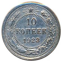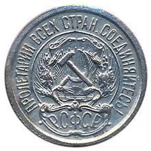 Реверс: В середине монеты стилизованный герб РСФСР - на геральдическом щите на фоне лучей солнца скрещенные серп и молот. По сторонам связки колосьев. Вся композиция обрамлена круговым ободком, который разорван внизу картушем с надписью "РСФСР". Между обрезом монеты и ободком лозунг "Пролетарии всех стран, соединяйтесь!".