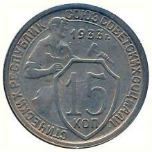 Аверс: в левой части круга, ограниченного линейным круговым ободком, изображение рабочего, смотрящего в право, с молотком в руке. Правой рукой рабочий придерживает щит с номиналом, написанным в две строки: "15 коп". Между круговым ободком и обрезом монеты надпись "Союз Советских Социалистических Республик".