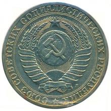 Реверс: в середине герб СССР с пятнадцатью витками перевязывающей ленты, обрамленный круговым ободком из сдвоенной линии. Между ним и обрезом монеты надпись "Союз Советских Социалистических Республик". Начало и окончание надписи разделено звездочкой.