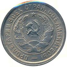 Реверс: герб СССР с семью витками перевязывающей ленты ограниченный линейным круговым ободком. Между обрезом монеты и ободком лозунг "Пролетарии всех стран, соединяйтесь!". Между первой и последней буквами лозунга тире.