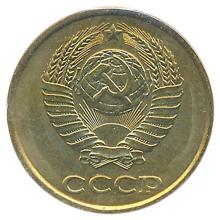Реверс: герб СССР с одиннадцатью витками перевязывающей ленты. Под ним полукругом со ступенчатым расположением букв надпись "СССР".