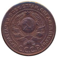 Реверс: герб СССР с семью витками перевязывающей ленты, под ним надпись "СССР", от которой начинается линейный круговой ободок. Между обрезом монеты и ободком лозунг "Пролетарии всех стран, соединяйтесь!".